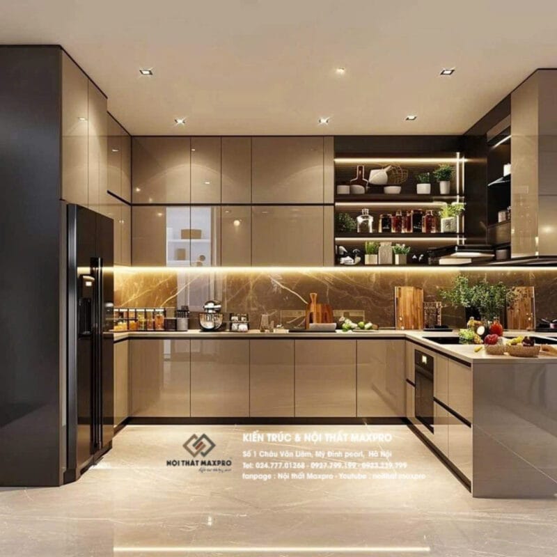Một mẫu tủ bếp khác được nhiều gia đình lựa chọn là tủ bếp kiểu chữ U. Mẫu thiết kế này dễ dàng tạo ra không gian làm việc linh hoạt. Khung inox chắc chắn phân bố đều trọng lượng, trong khi cánh acrylic có độ bóng nổi bật, giúp không gian bếp luôn sáng sủa. Các gam màu như xanh ngọc hoặc xám nhạt thường được ưa chuộng, tạo nét hiện đại và phong cách cho không gian.