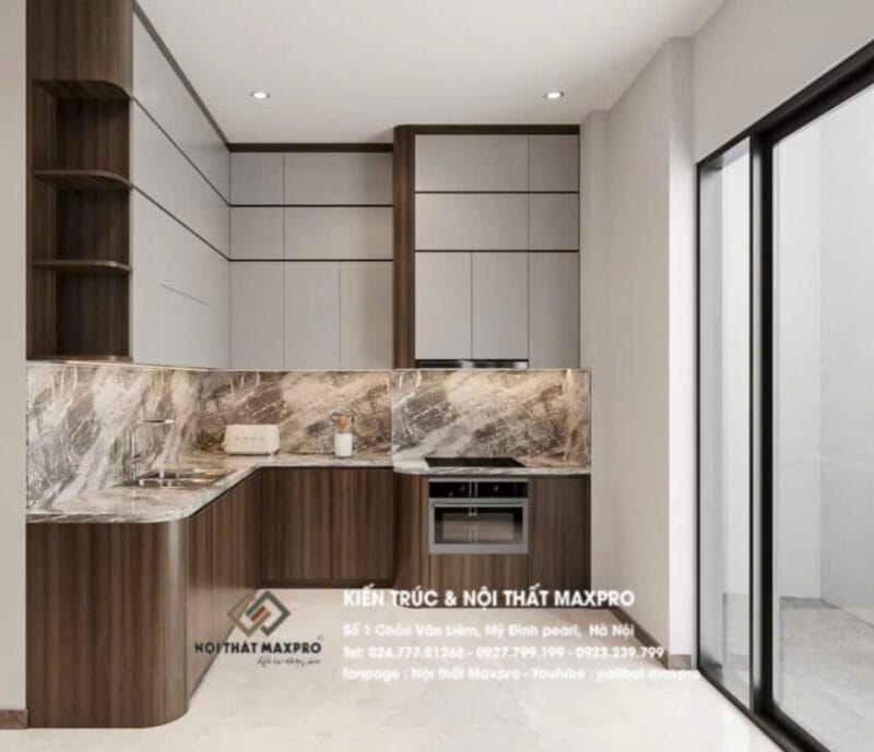 Mẫu tủ bếp đầu tiên có thể kể đến là tủ bếp chữ L với khung inox không gỉ, kết hợp cánh acrylic màu trắng. Thiết kế này không chỉ giúp tiết kiệm diện tích mà còn mang đến vẻ sang trọng, thông thoáng cho không gian bếp. Hệ tủ trên và dưới được bố trí hợp lý, giúp tối ưu hóa khả năng lưu trữ. Thêm vào đó, mặt bàn bếp bằng đá granite cũng góp phần tăng tính thẩm mỹ và dễ dàng vệ sinh.